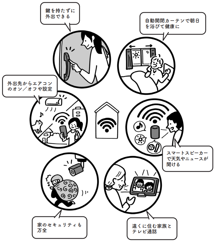 寒い冬、家路について玄関前でスマホ操作すると、カチッと鍵が開く。家の中に入ると、エアコンを消し忘れたわけでもないのに、すでに家の中は適度に暖かさ。湯船にもお湯がはられ、いつでも1日の疲れを癒せる状態に。入浴して、夜ご飯を食べてくつろいだ後、就寝の準備をして布団に入りスマホアプリを操作して、エアコンやリビングの照明をオフにして、最後に寝室の照明を消す。