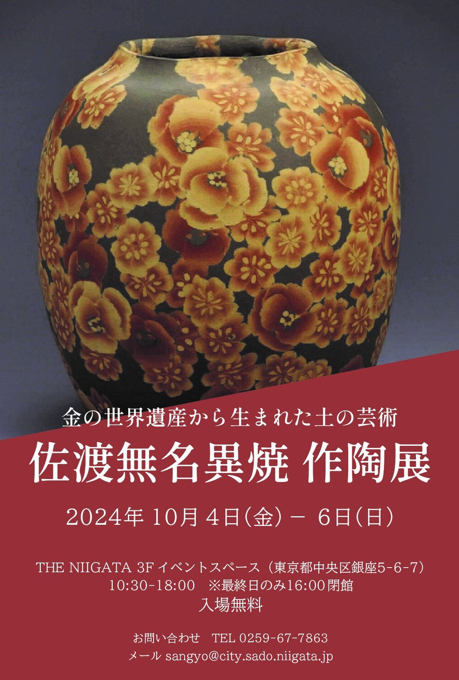 佐渡市主催、世界⽂化遺産登録となった「佐渡島の⾦⼭」とも密接な関りをもつ「※佐渡無名異焼」作陶展を、東京都銀座にある新潟のアンテナショップ「THE NIIGATA」で開催します。