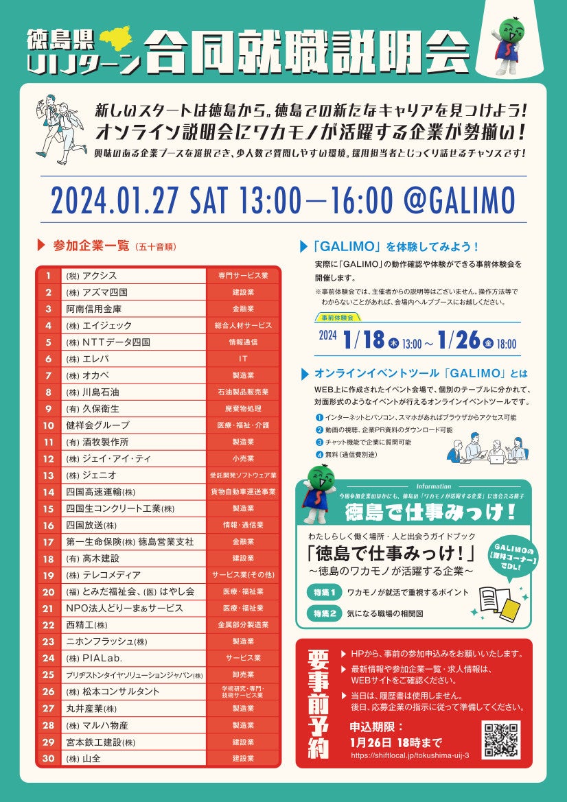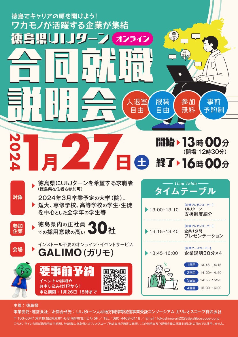 徳島県内のワカモノが活躍する企業が集結!「徳島県UIJターンオンライン合同就職説明会」(1/27(土)開催)について