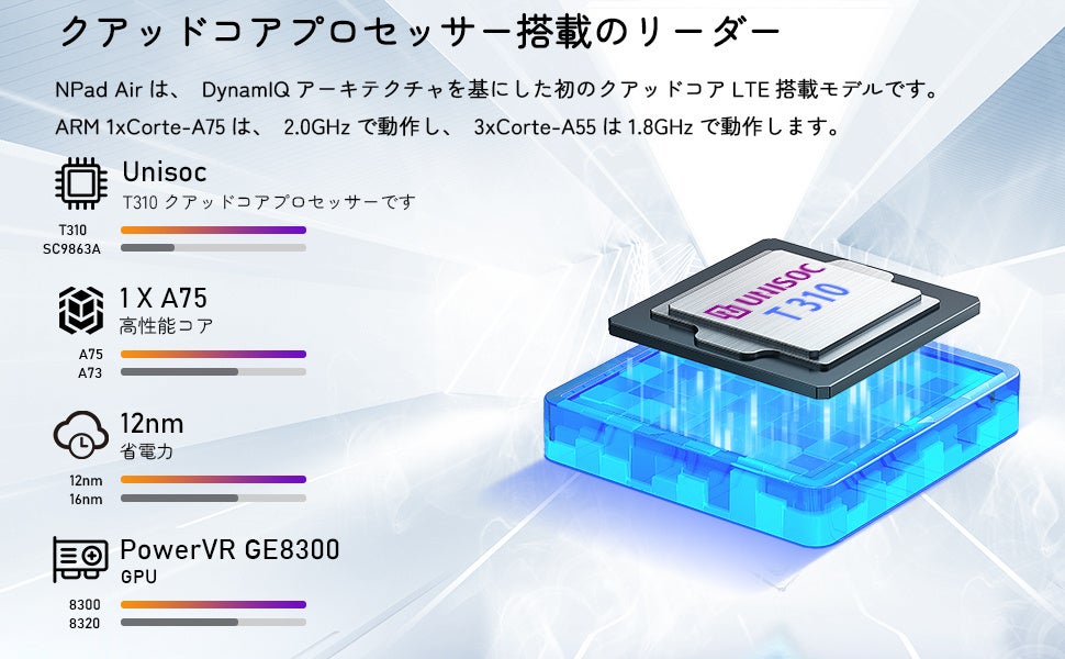 高性能4コアCPU + 大容量メモリ: N-one Npad Air Android12 タブレットはUnisocの4コアCPU「CPU T310」を搭載。低消費電力と低発熱で、PVR GE8300グラフィックスプロセッサと組み合わせて、軽快な動作と高速な処理が可能。多彩な機能が強化され、動画視聴やウェブプラウジング、音楽鑑賞などが最適。