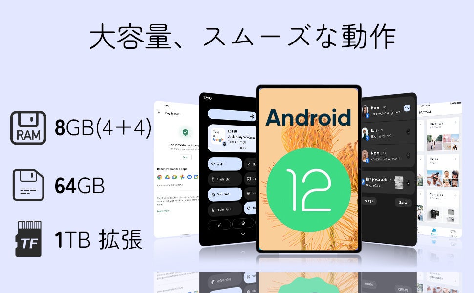 12GB(6GB+6GB拡張)+128GB+1TB拡張、6600mAhバッテリー+USB-C充電。スマートなRAMの割り当て機能で処理速度が向上し、多くのファイルを保存可能。