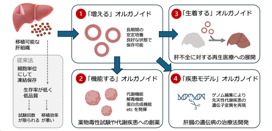従来の方法では、成人肝細胞の体外増殖は困難であり、その過程での肝細胞の機能喪失が問題でした。本研究チームは、新たな培養技術を確立し、成人の肝細胞をオルガノイドとして百万倍以上に増殖させることに成功しました。さらに分化肝細胞オルガノイドは、胆汁を排泄する毛細胆管を作り、生体内に匹敵する薬物代謝や脂質代謝機能を示しました。この肝細胞オルガノイドを肝傷害モデルマウスに移植することで、肝細胞オルガノイドは周囲のマウス肝細胞と馴染むように生着し、肝臓機能が回復することを確認しました。多彩な機能を有した肝細胞オルガノイドは創薬研究や疾患研究、そして再生医療への展開が期待されます。