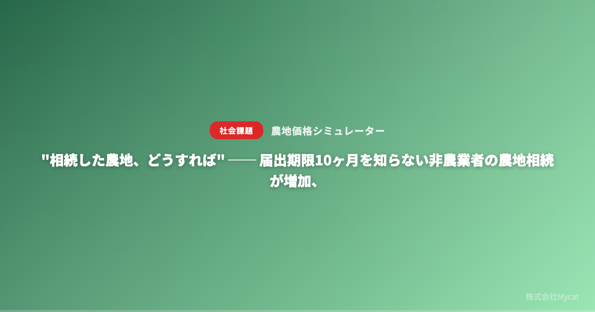 株式会社Mycat(本社:東京都目黒区)は、非農業者による農地相続の増加と情報格差の課題を受け、農地の売却相場と転用可能性を即時に診断できるWebサービス「農地価格シミュレーター」(https://nouchi.xyz)の提供を開始いたします。