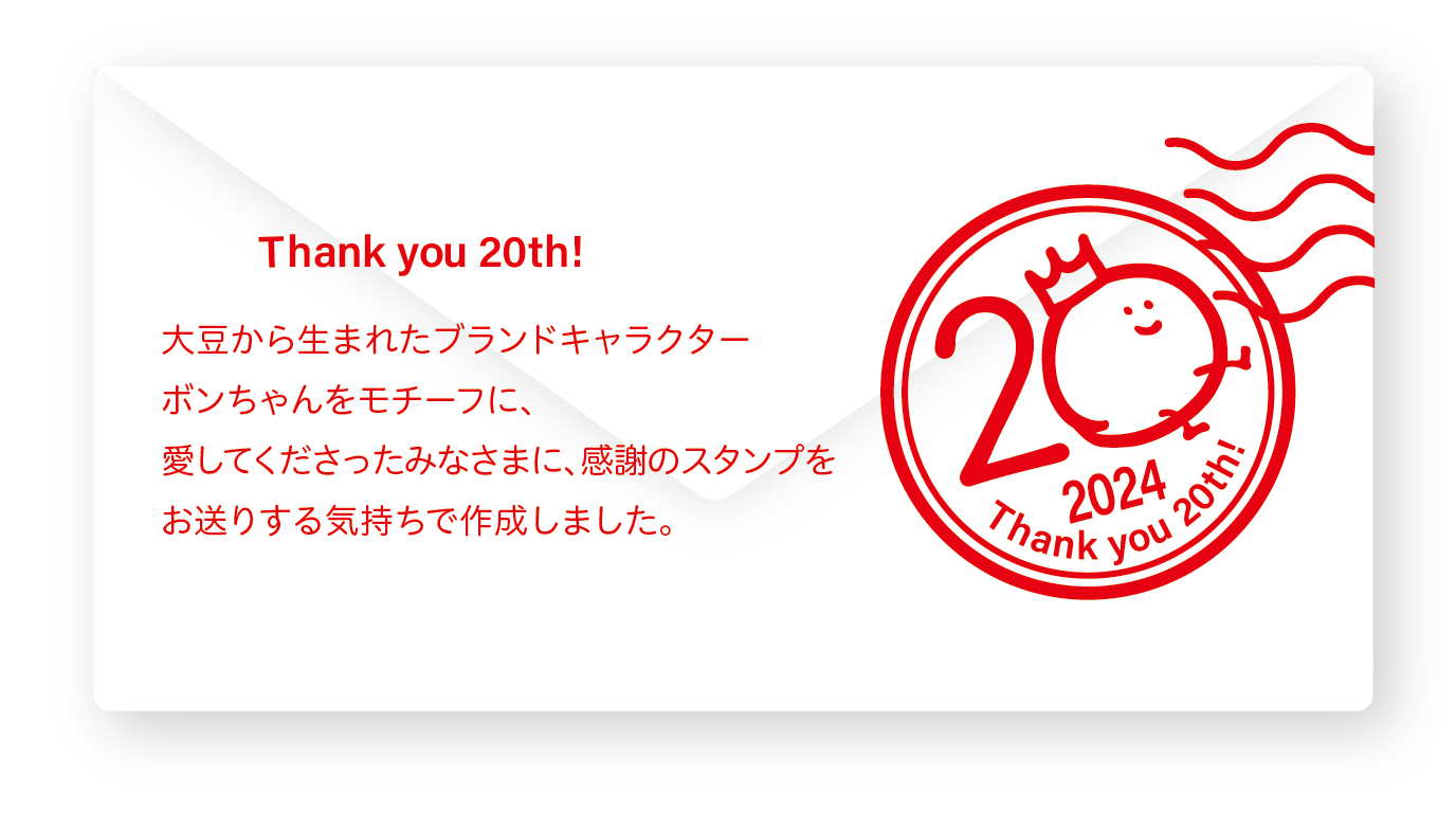 公式キャラクターである大豆の妖精「ボンちゃん」。消印スタンプをイメージしたスぺシャルバージョンで20周年を盛り上げます。