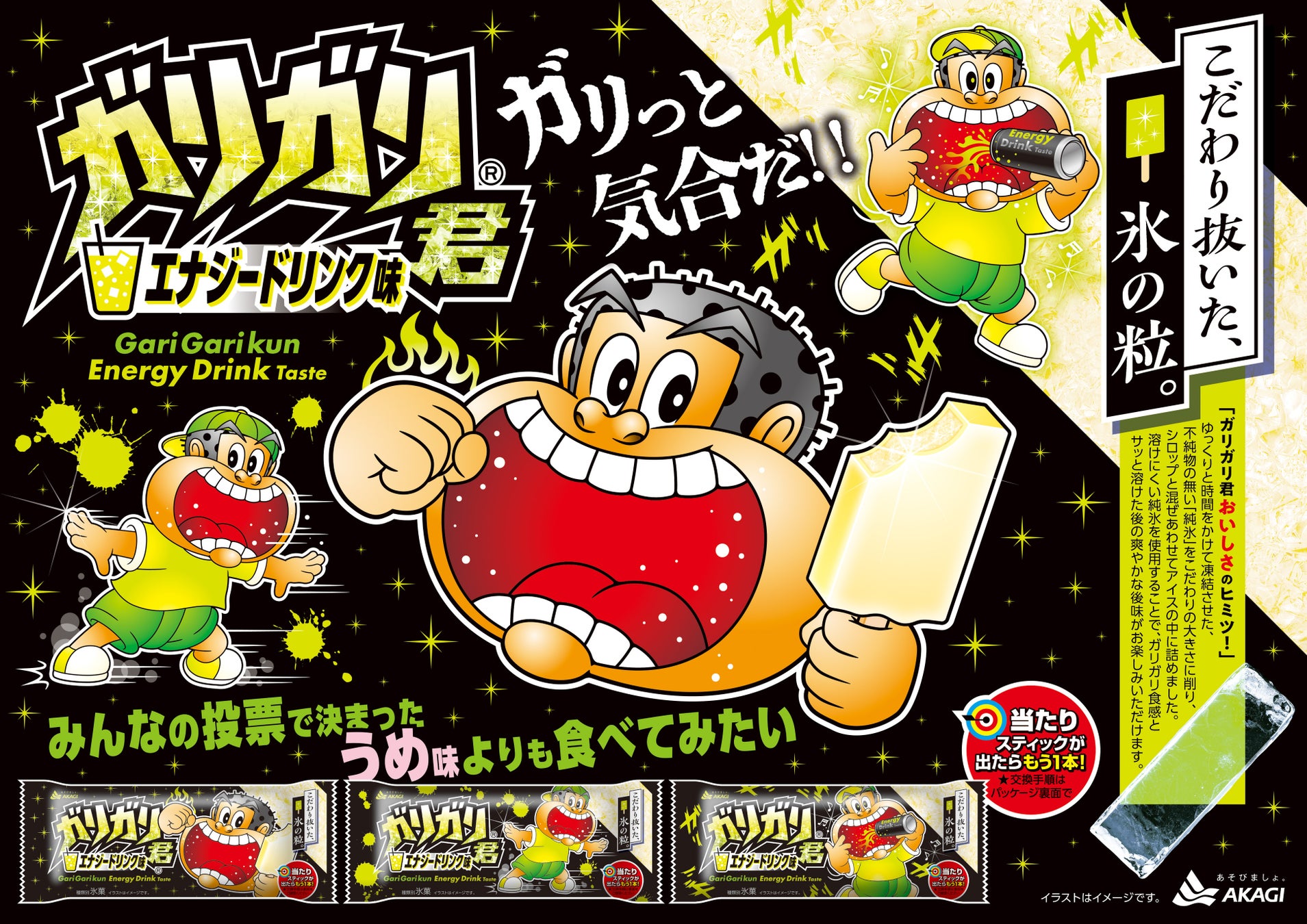 2022年の8月に実施した、40周年記念商品である「ガリガリ君うめ」よりも食べてみたい味をTwitterで投票する企画において、うめ味、ザクロ酢味、ガリ味を抑えてエナジードリンク味が1位に輝き、今回発売に至りました。