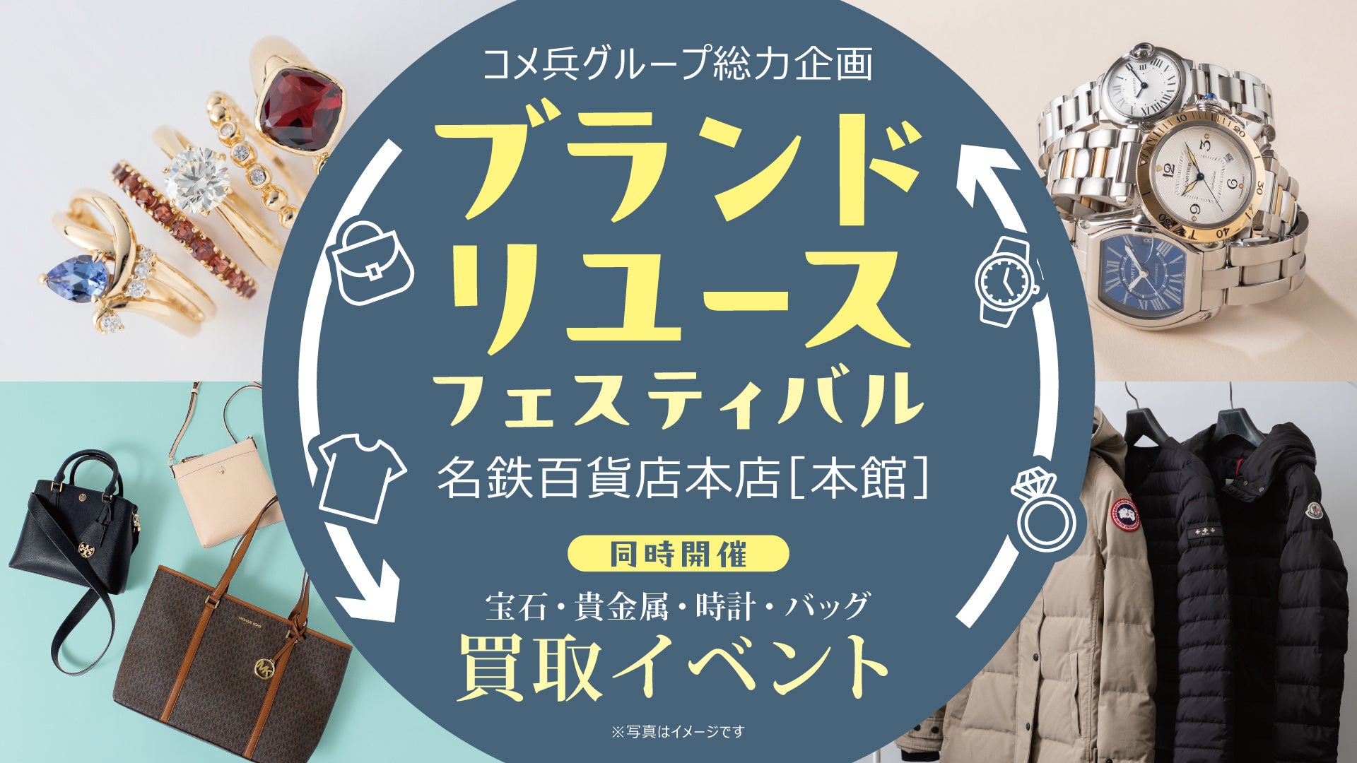 コメ兵グループのうち、KOMEHYO、BRAND OFF、Rodeo Drive、の三ブランドおよび、KAITORI GO(出張買取)の屋号の店舗で合同開催。名鉄百貨店本店の催場内のおよそ200坪のスペースにて、お客様に「売る」「買う」双方のリユース体験をしていただけます。