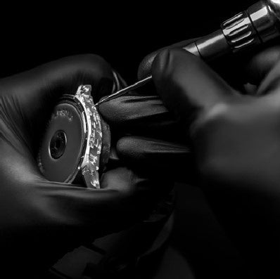 アヴァンギャルドをさらに高めるため、スイスのラグジュアリーウォッチブランドであるタグ・ホイヤーと、ダイヤモンドのデザイン分野でパイオニアの新興企業であるCapsoulが協力し、3時の位置にダイヤモンドのみを使用した驚くべきリューズを開発しました。その両側には、ブラックのDLC加工を施したプッシャーを配置してウォッチに洗練されたマットな質感を与え、ダイヤモンドの輝きとのコントラストを生み出しています。