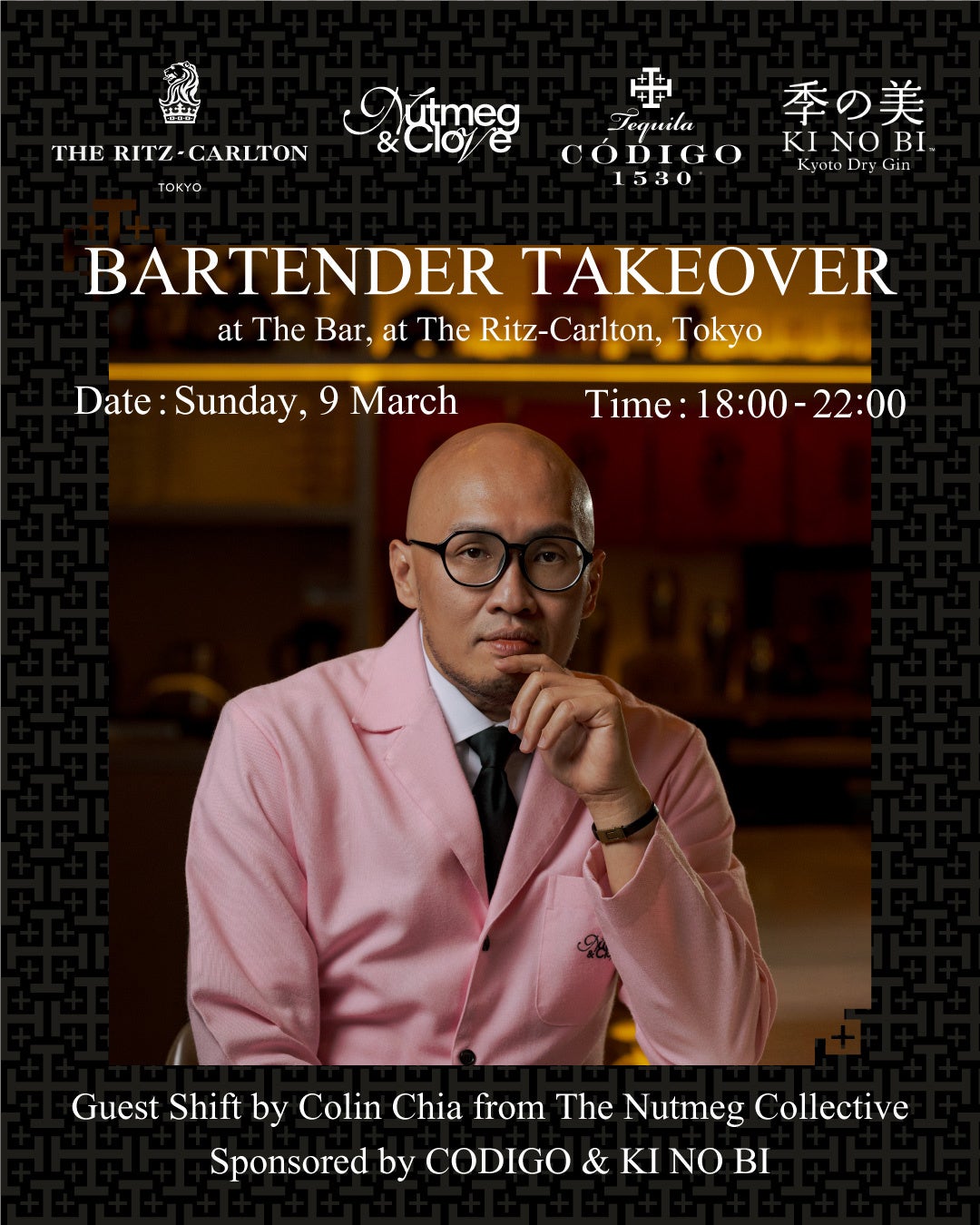 ペルノ・リカール・ジャパン株式会社(本社:東京都文京区 代表取締役社長:トレイシー クワン)が展開する無添加プレミアムテキーラ「コディゴ 1530」とプレミアムクラフトジン「季の美 京都ドライジン」は、ザ・リッツ・カールトン東京の「ザ・バー」とコラボレーションし、2025年3月9日(日)18時からカクテルイベント「バーテンダー テイクオーバー」を開催します。本イベントには、シンガポールのバーシーンを牽引し数々の受賞歴を誇るColin Chia氏(Nutmeg Collective CEO、The Bangkok Collective CEO)をゲストバーテンダーに迎え、「コディゴ 1530」と「季の美 京都ドライジン」のスペシャルカクテルを提供します。