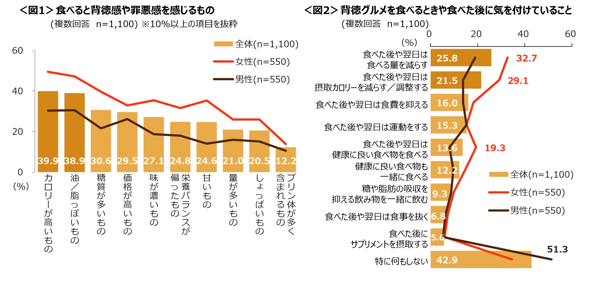 4割の人が「カロリーが高いもの」と「油/脂っぽいもの」を食べると背徳感・罪悪感を感じると回答。<図1>
