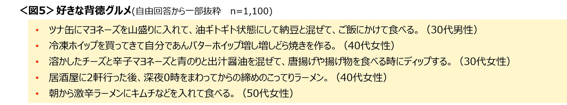 好きな背徳グルメを自由回答で聞くと、「ツナマヨ油ギトギト納豆ご飯」や、「あんバターホイップ増し増しどら焼き」といったオリジナルの背徳グルメの回答が得られた。 <図5>