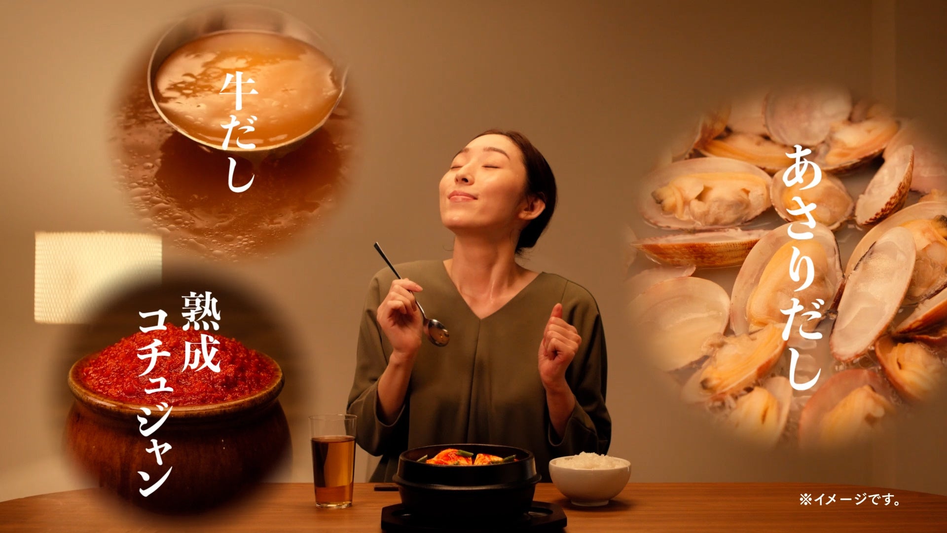 仕事帰りにほっと一息、安らぐ時間に自宅でスンドゥブチゲを食べる女性。これまで食べてきたスンドゥブとはなにかが違うことに、ひと口で気づきます。それは、力強い辛味に加えて、あさりと牛だし、そして熟成コチュジャンが生み出すコク深い本場の味わい。素材たちが織りなすうまさに導かれるかのように、汗をかきながらも食べ進めていくのでした。くせになる本格派の味、ぜひ一度お試しください。
