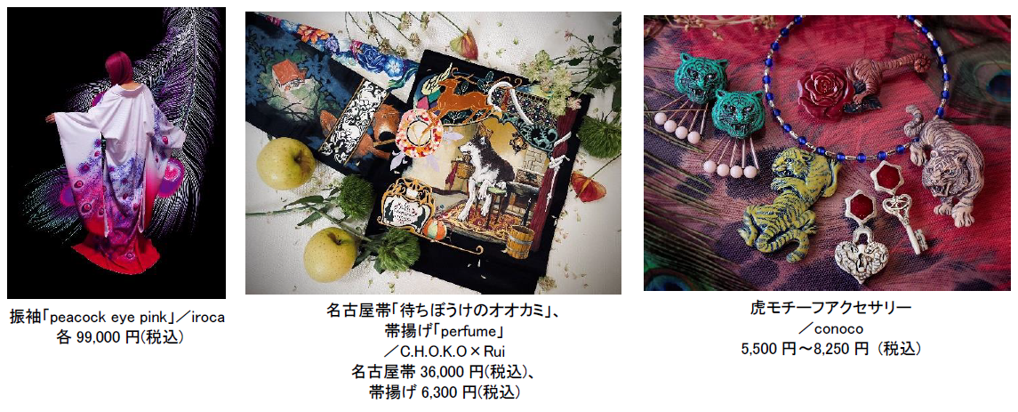 また、ゲストブランドである、キモノディレクター・カリスマキモノブロガーであるCHOKOのブランド「C.H.O.K.O」では、画家Ruiとのコラボレーション名古屋帯が登場。さらに、フツウの可愛いじゃ物足りないオトナのためのアクセサリー「conoco」では、虎モチーフアクセサリーなど多数アイテムを展開いたします。