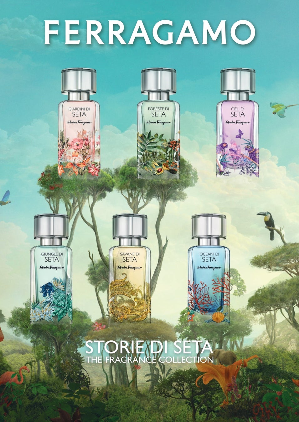 フェラガモの美しいシルクアイテムのモチーフが何十年にもわたって貴重な糸で紡がれてきたように、さまざまな夢や 色彩、感情を紡いだ唯一無二のコレクション「ストリエ ディ セタ」。 その中核をなす幻想的な世界観が、2つの新しい香りが織りなす風景によってさらに広がり力強く躍動します。
