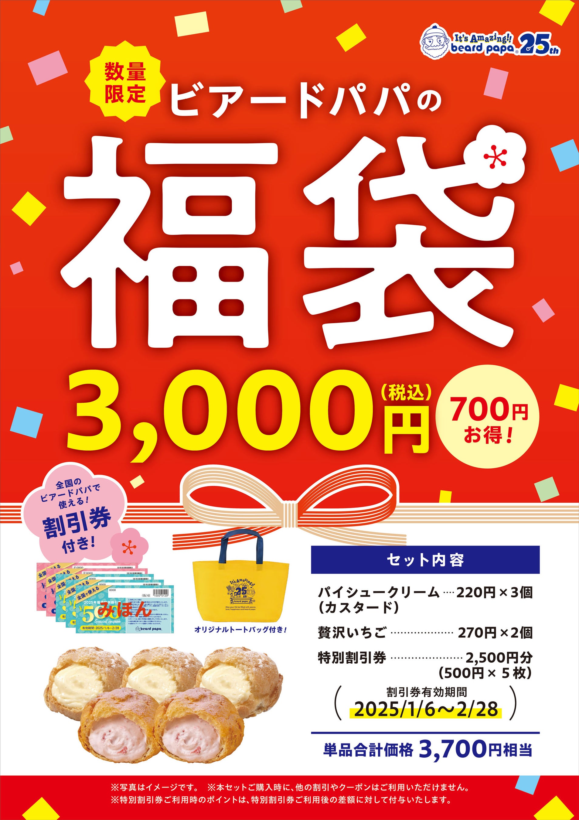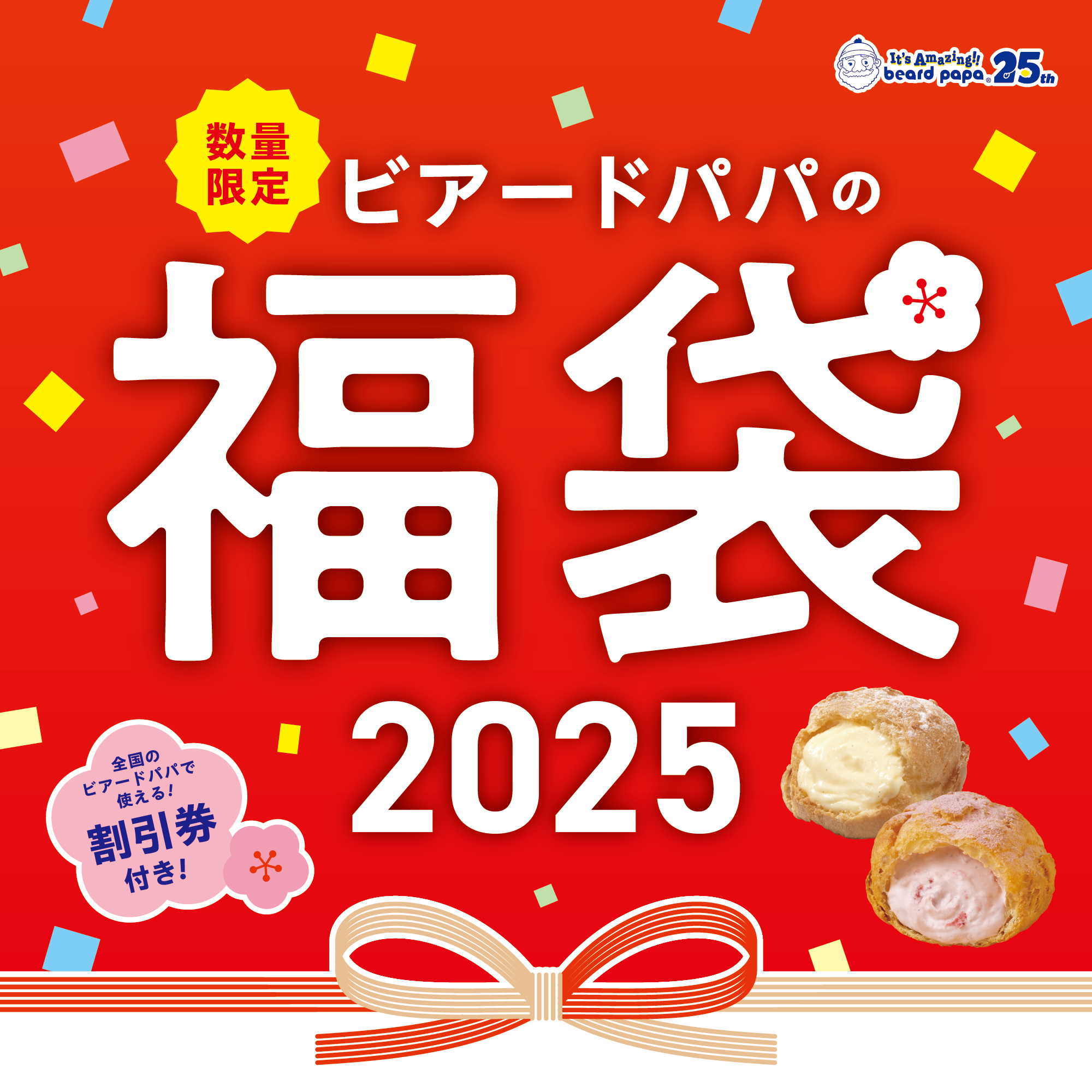 株式会社DAY TO LIFE(本社:大阪府大阪市北区、代表取締役:杉内健吉)は、シュークリーム専門店ビアードパパにて2025年1月1日(水)から、特別割引券、25周年記念オリジナルデザイントートバック、シュークリーム5個がセットになった“ビアードパパの福袋2025”を数量限定で販売いたします。福袋購入時はビアードパパ モバイルアプリポイントも付与され、さらにお得に福袋をお楽しみいただけます。この機会にぜひビアードパパ モバイルアプリをダウンロードしていただき、新年の幕開けをビアードパパのシュークリームとともに笑顔あふれるひとときにしてみませんか。