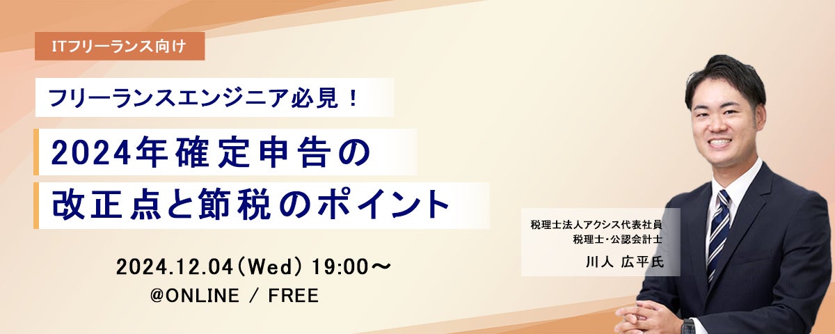 本セミナーでは、ITフリーランスエンジニアにて「既に基本的な確定申告の知識がある方」「これまでご自身で確定申告をされている方」を対象に、「節税対策」や「定額減税対応」、「2024年確定申告の改正点」などについて解説します。確定申告に関する知識を深めたい方、また確定申告に関わる制度の変更点などをおさえておきたい方など、是非ご参加ください。