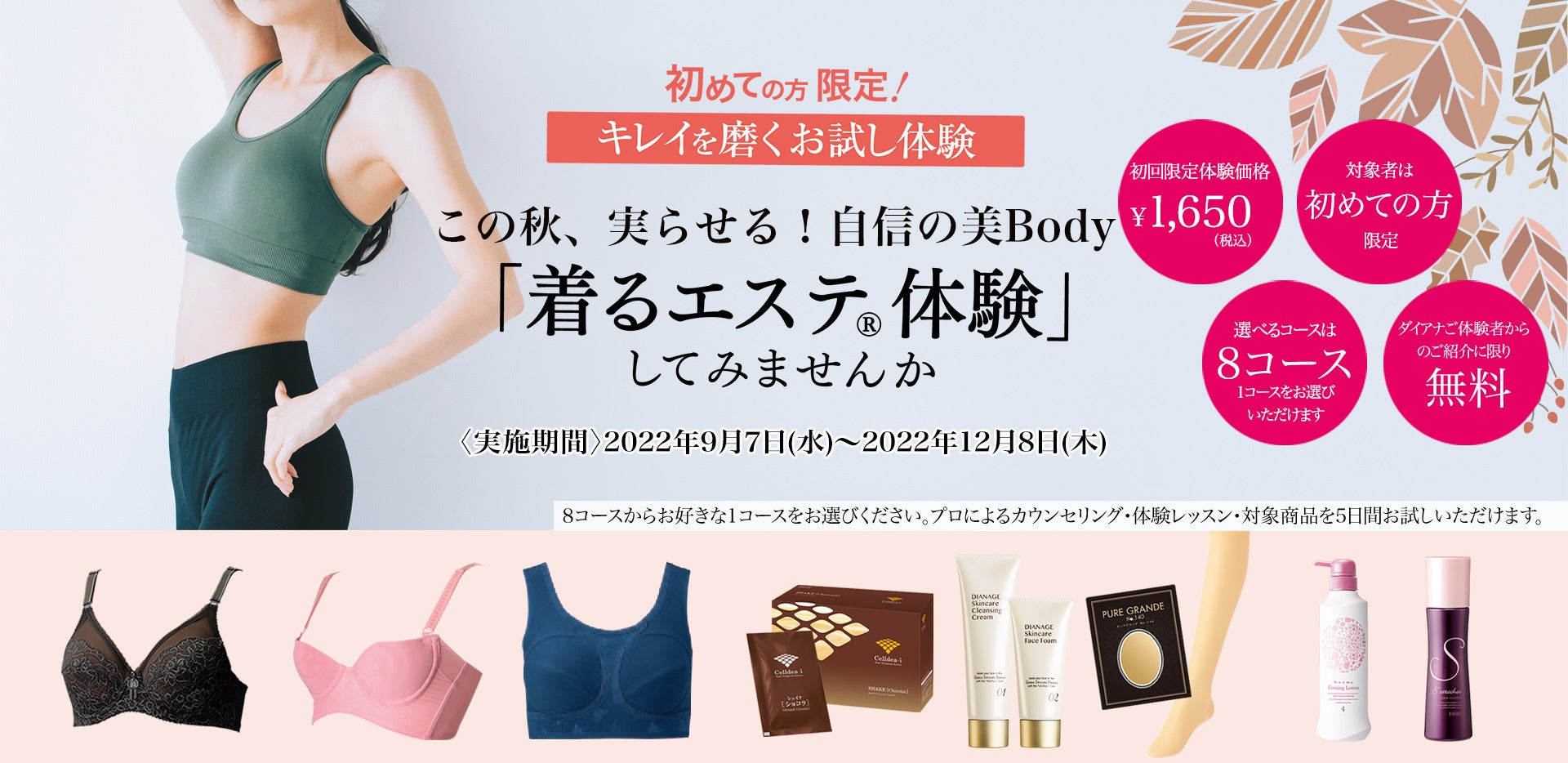 | 体験コース | ① 真実の「着るエステ®」体験 ―豊富な69サイズから選ぶ補整下着「ダイアジェンヌ ブラジャー」の体験 ② 魅力ボディ体験 ―バストラインを盛って魅せる!補盛下着「リセ グラマラス 体験用ブラジャー」の体験 ③ おやすみ中のしっかり補整体験 ―寝ている間も快適ボディメイキング「ナイトジェンヌ ナイトブラ」の体験 ④ ダイエットでヘルシーボディ体験 ―置き換えダイエットをサポートする栄養補助食品「セルディア」の体験 ⑤ 生まれ変わった、わたしの肌ケア体験 ―しっかり洗浄、なのにうるおう洗顔「ディアナージュ ケキュア クレンジングクリーム&フェイスフォーム」の体験 ⑥ すらり美脚サポート体験 ―医療用弾性ストッキング「ピュアグランデ No.140」の体験 ⑦ 気なる部分の集中ケア体験 ―マッサージ後の肌を引き締めるボディケア化粧品「ノエマ プロ ファーミングローション」の体験 ⑧ ふんわりキレイ、ヘアケア体験 ―頭皮環境を整え、発毛を促進する育毛剤「サターシェ 薬用育毛エッセンス」(医薬部外品)の体験 |