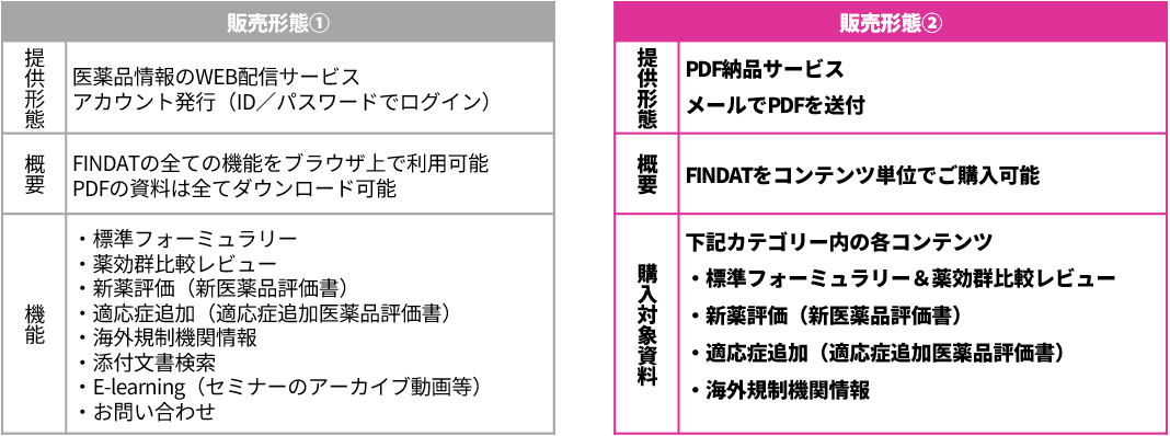 このたび「FINDAT」は、販売形態を多様化し、PDFによるコンテンツ単位でも購入いただけるようにいたしました。従来は、原則、法人契約でのWEB配信サービスのみでしたが、今後は必要な1コンテンツから個人でも購入可能です。各施設のフォーミュラリー運用状況やDX化にあわせて手軽に購入いただけます。「FINDAT」は、さまざまなニーズに合わせたサービス展開により、医療機関や地域におけるフォーミュラリー運用を支援いたします。