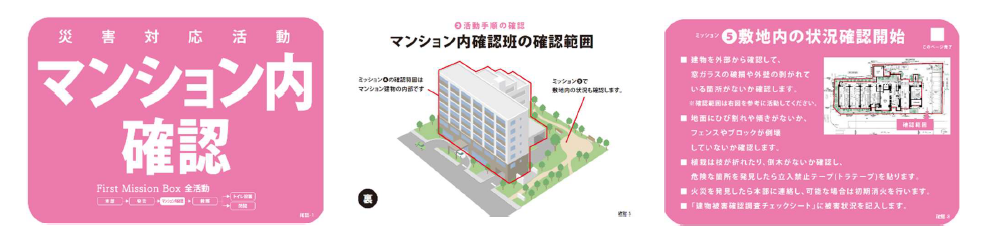 これまで分譲マンションでは、災害時の混乱を防ぐために、あらかじめ防災組織をつくり、活動内容を明確にしたうえで、マンションごとに独自の防災計画書を作成してきました。しかし、災害はいつ・どこで起こるか分かりません。そこで、より実効性を高めることを目指し「FMB」と、長引く被災生活を想定し支援する情報を提供する「Second Mission Box(セカンドミッションボックス)」(以下、「SMB」)を導入しました。FMBは、大規模な災害が起こった際に、居住者同士で迅速に初期活動を行うための指示カードが入った防災ツールです。災害時に共用部に設置されたボックスを開け、中に入った指示カード通りに動くことで、自然とその場に集まった居住者同士で災害時の初期活動を実施することができる仕組みです。