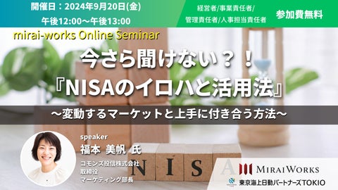 株式会社みらいワークス(本社:東京都港区、代表取締役社長 岡本 祥治、以下「当社」)は、2024年9月20日(金)に、「資産形成のポイントやNISAの上手な活用法」について、コモンズ投信株式会社 福本 美帆氏を迎えてオンラインセミナーを開催します。