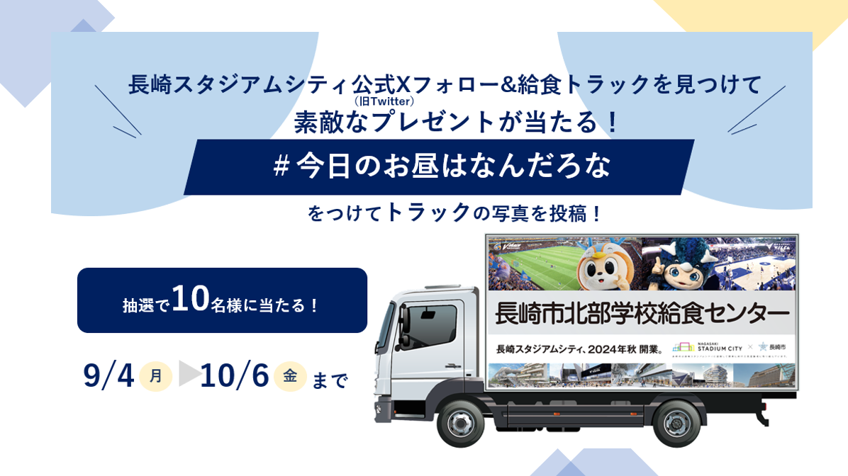 長崎スタジアムシティ公式X(旧Twitter)フォロー&給食トラックの写真をハッシュタグ付きで投稿いただくと、抽選で10名様に素敵なプレゼントをいたします!