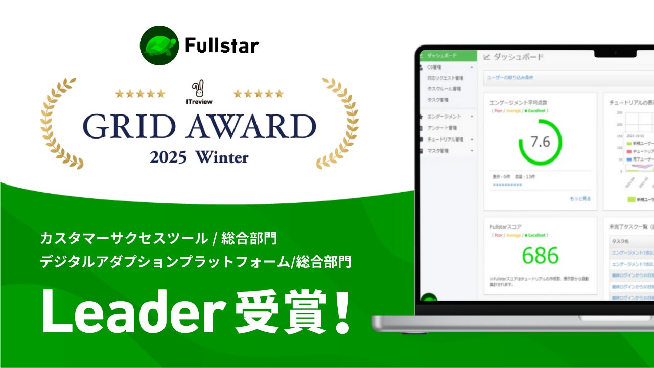 スターティアホールディングス株式会社(本社:東京都、代表取締役:本郷秀之、証券コード:3393)は、連結子会社でデジタルマーケディング事業を手掛ける)クラウドサーカス株式会社(本社:東京都、代表取締役:北村健⼀)が提供する、CSM(カスタマーサクセスマネジメント)ツール『Fullstar(フルスタ)』が、アイティクラウド株式会社(本社:東京都、代表取締役:⿊野源太)が主催するアワード「ITreview Grid Award 2025 Winter」、カスタマーサクセスツール部⾨内の総合部⾨において、満⾜度と認知度の双⽅が優れた製品であると評価され、Leaderを受賞したことをお知らせします。また、デジタルアダプションプラットフォーム部門の総合部門でも5期連続でLeaderを受賞しました。