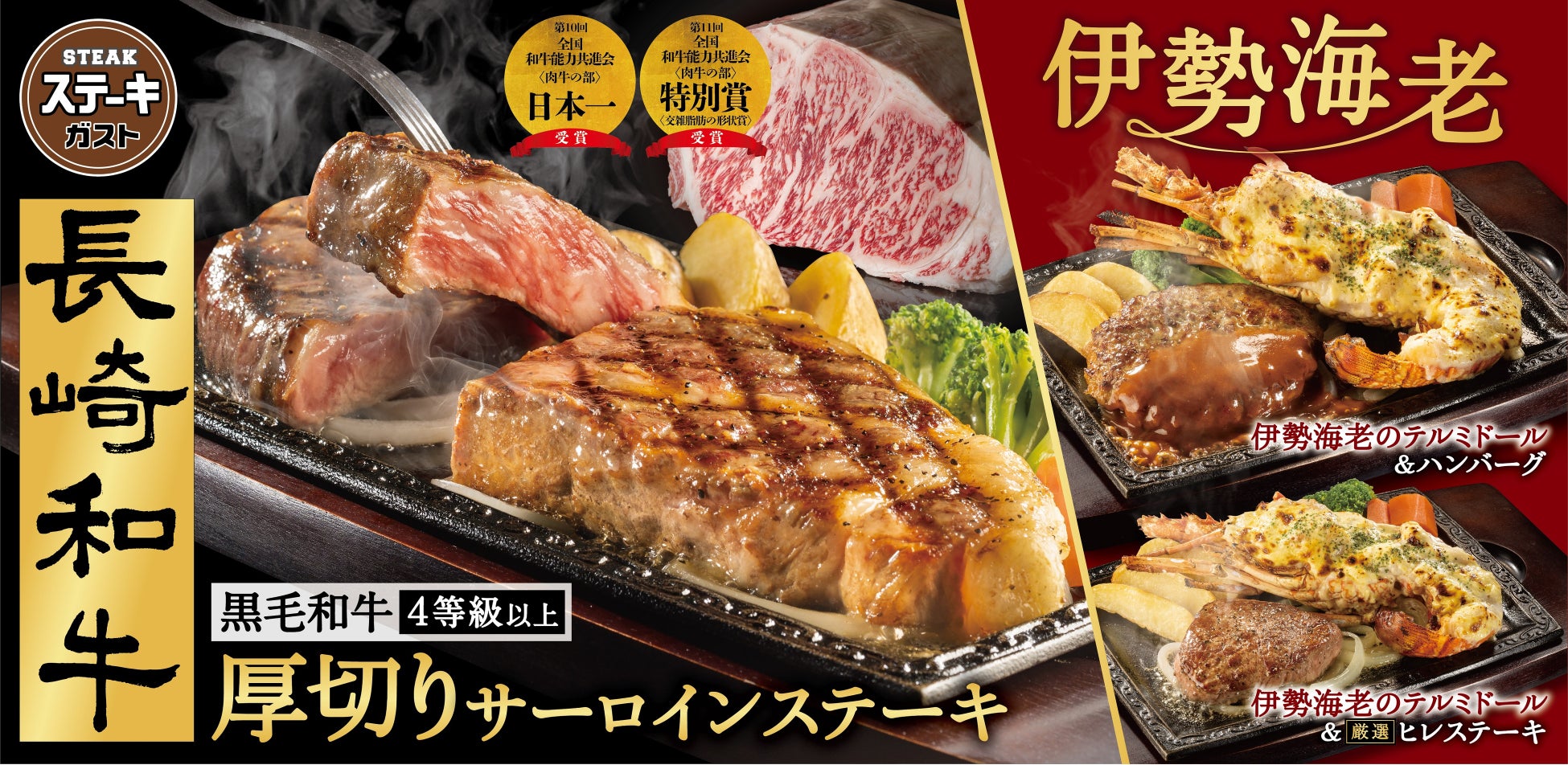 | 【年末年始限定 スペシャルメニュー おすすめポイント】 ① 【贅沢厚切り】“4等級以上”の黒毛和牛“厚切りサーロインステーキ”が初登場 上質な黒毛和牛サーロインの全店展開を初めて実現。店内にて1枚1枚手切りでカットし、提供します。 ② 【厳選銘柄】“和牛のオリンピック”日本一(※1)。高品質の長崎和牛をステーキで堪能 とろける脂と赤身の旨みのバランスが絶品。柔らかい肉質とジューシーさを併せ持つブランド和牛です。 ③ 濃厚「伊勢海老のテルミドール」等ご褒美ディナーにもぴったりの特別なメニュー展開 プリプリの伊勢海老(※2)をこだわりのWソースで楽しむテルミドールは味わい・見た目共に華やかな逸品です。 |