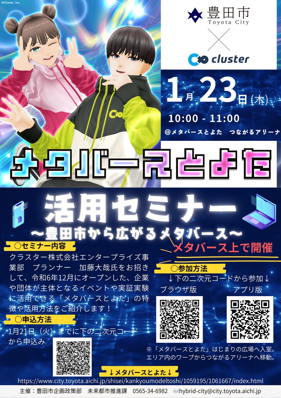 この度、多くの方に「メタバースとよた」の活用方法について知ってもらうため、「メタバースとよた」の特徴や活用事例などを学ぶことができる「メタバースとよた活用セミナー~豊田市から広がるメタバース~」を以下のとおり開催します。
