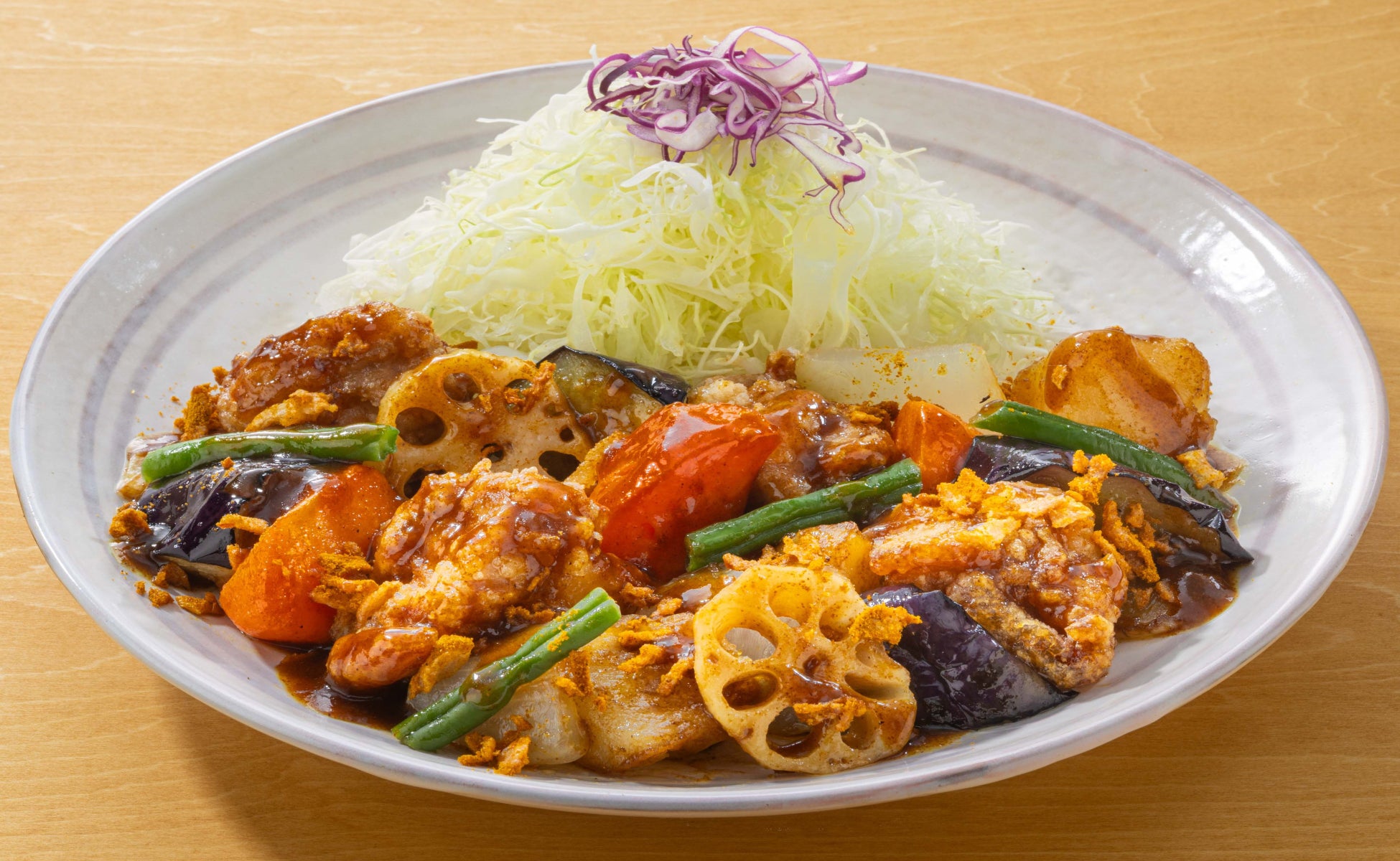大戸屋で人気の黒酢あんシリーズにこの夏限定の新味が登場。カリッと揚げた鶏竜田と彩り豊かな野菜に、黒酢の酸味とカレーのコクが調和し、深みのある味わいに。仕上げのカレー粉とフライドオニオンが香ばしい香りとザクザク食感を加え、食欲を刺激する一皿です。