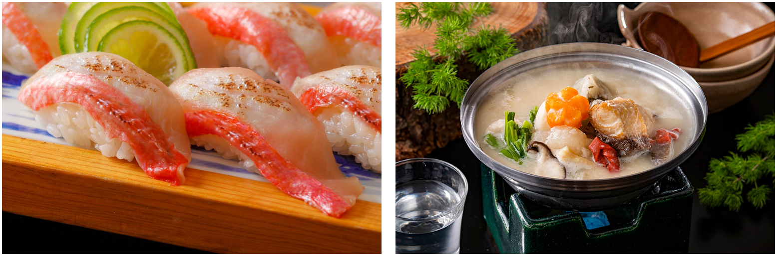 炙ることで適度に脂が溶け、甘みを増す<金目鯛の炙り寿司>。