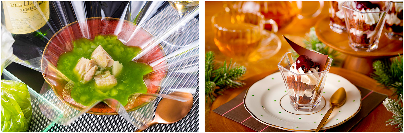 <黒い森>という意味のドイツ南西部の伝統菓子「フォレノワール」をトライフル仕立てにしたデザートもお目見えします。チョコレートベースのスポンジに酸味のあるダークチェリーのコンフィチュールを合わせたデザートは食後にぴったりのサイズ。