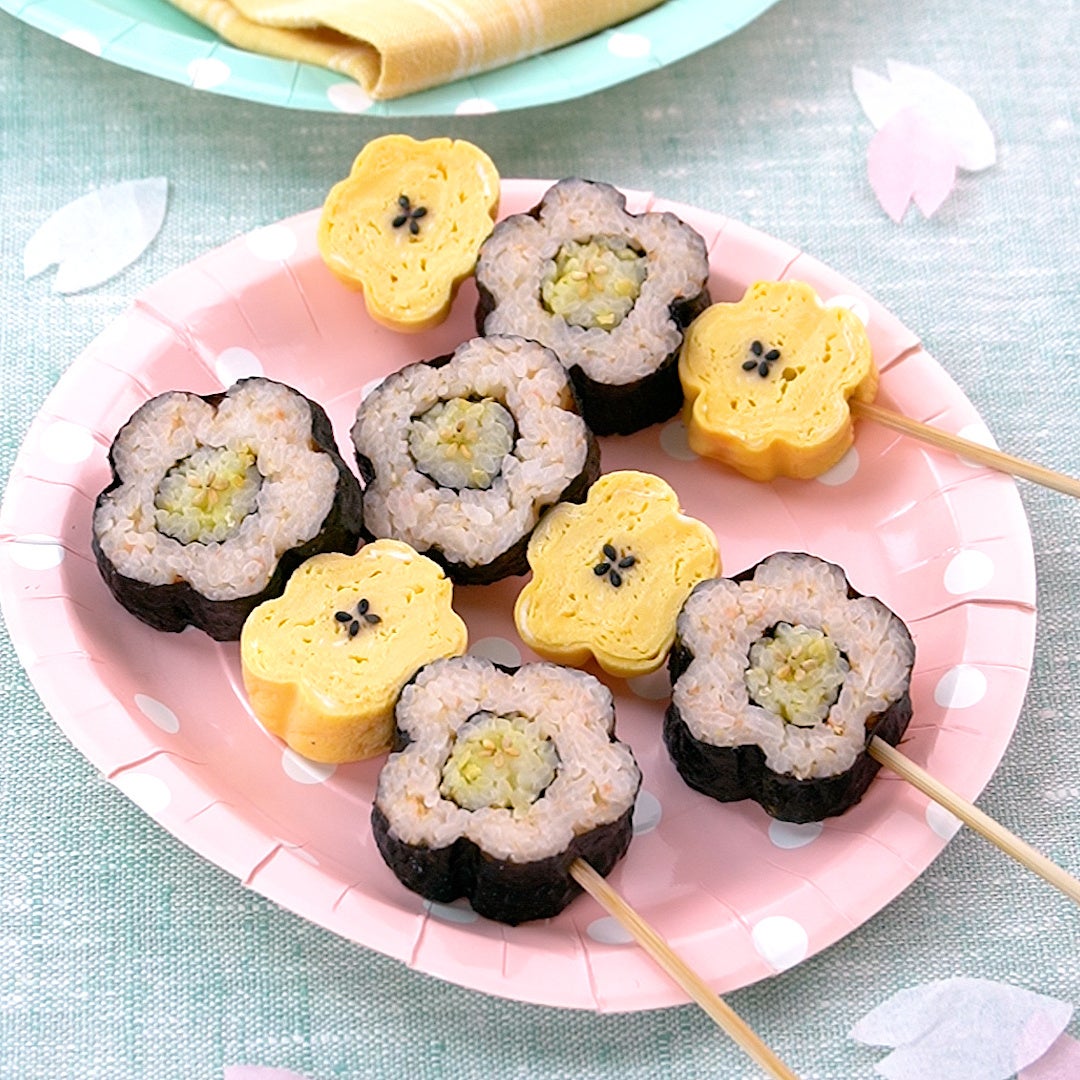 お花の海苔巻きおにぎりと卵焼きがかわいい!串に刺せばおにぎりとおかずを一緒に楽しめて、屋台の雰囲気を楽しみながらお花見が満喫できます♪今年のお花見にぜひ作ってみてくださいね。