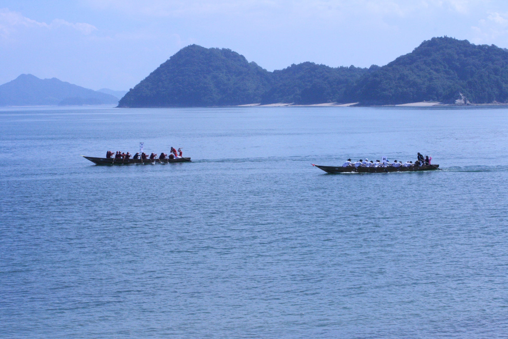 櫂伝馬とは海での情報伝令の役目を担った木造船で、14人の漕ぎ手が独特の掛け声と太鼓で調子を合わせ、心を一つにして櫂の動きを合わせることで前進する仕組みです。その後、当初の役割から神事としての意味合いを持つようになり、今では祭礼行事に伴う競漕へと趣が変化しています。