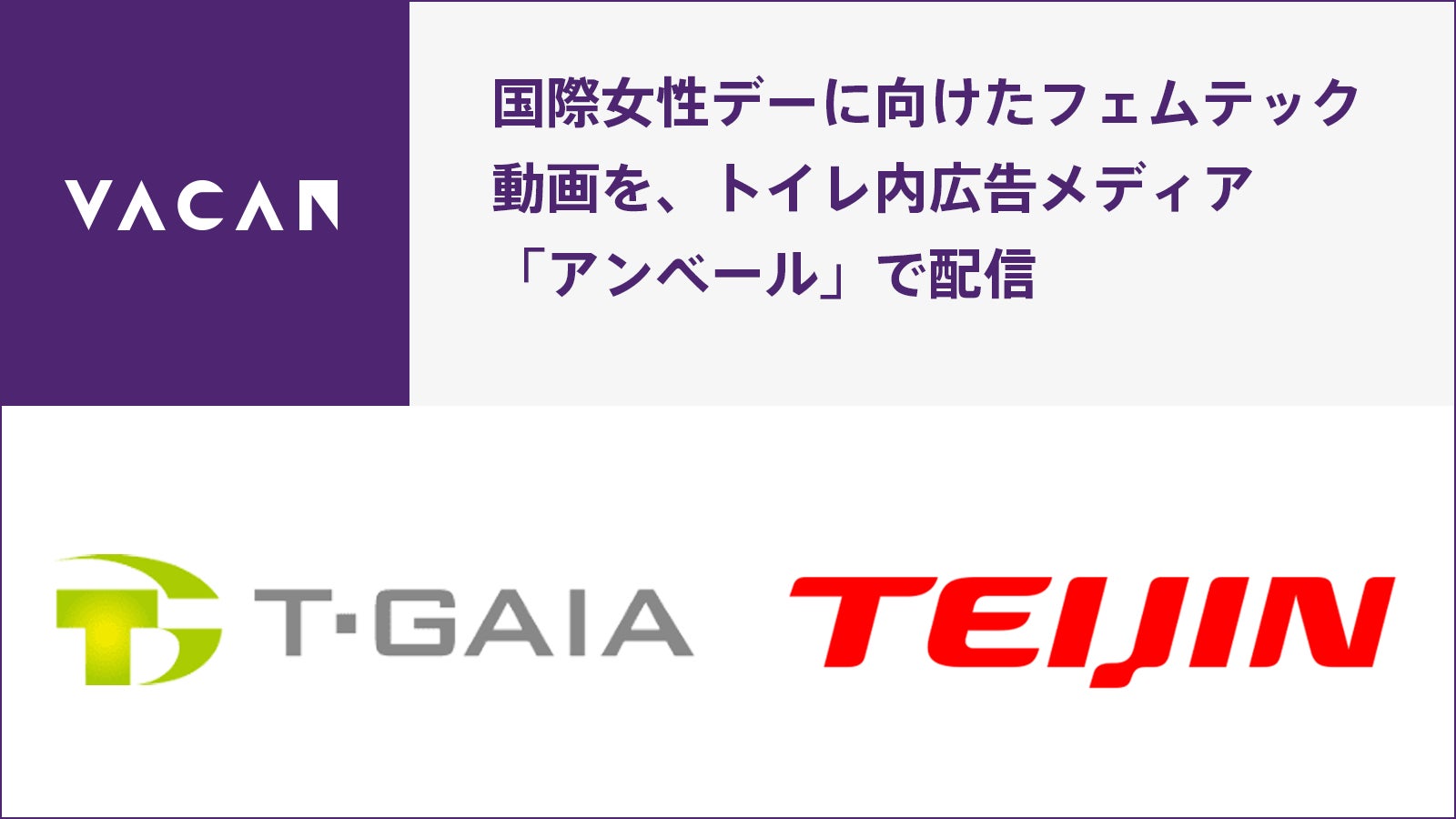 AIとIoTを活用してムダな「待つ」をなくすサービスを提供するスタートアップ、株式会社バカン(本社:東京都千代田区、代表取締役:河野剛進、以下「バカン」)は、株式会社ティーガイア(本社:東京都渋谷区、代表取締役社長: 石田 將人、以下「ティーガイア」)が新たに展開するサロン型フェムテックSTORE「FEMTECH LAB」、及び帝人株式会社(本社:大阪市北区、代表取締役社長執行役員:内川 哲茂、以下「帝人」)が展開する、膣内フローラを整える「乳酸菌UREX(※1)(ユーレックス)」のプロモーション動画を、トイレ広告メディア「アンベール」が導入されているオフィスの女性トイレにて配信します。配信は3月8日の国際女性デーに先駆け、2月26日〜3月3日の日程でおこないます。