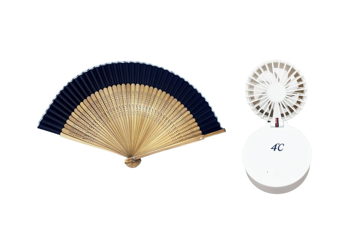 期間中にファッションジュエリーまたはブライダルジュエリーをお買い上げいただいたお客様に、4℃ロゴ入り扇子またはハンディ扇風機をプレゼント。どちらかおひとつをお好みでお選びいただけます。