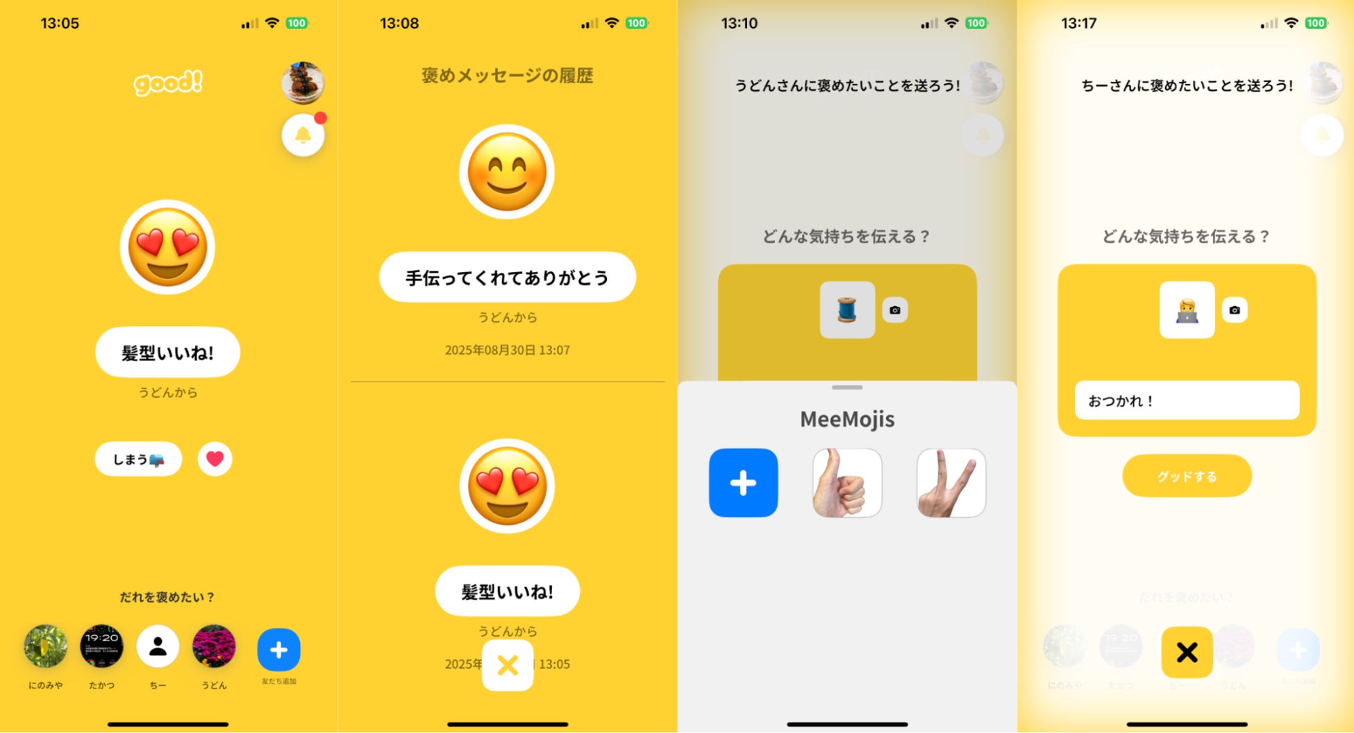 「good!」は、友だちや好きな人に「褒めたい」「ありがとう」という気持ちを伝えるためのアプリです。直接言葉にするのが恥ずかしいときでも、絵文字と簡単な一言で気軽に気持ちを届けられます。