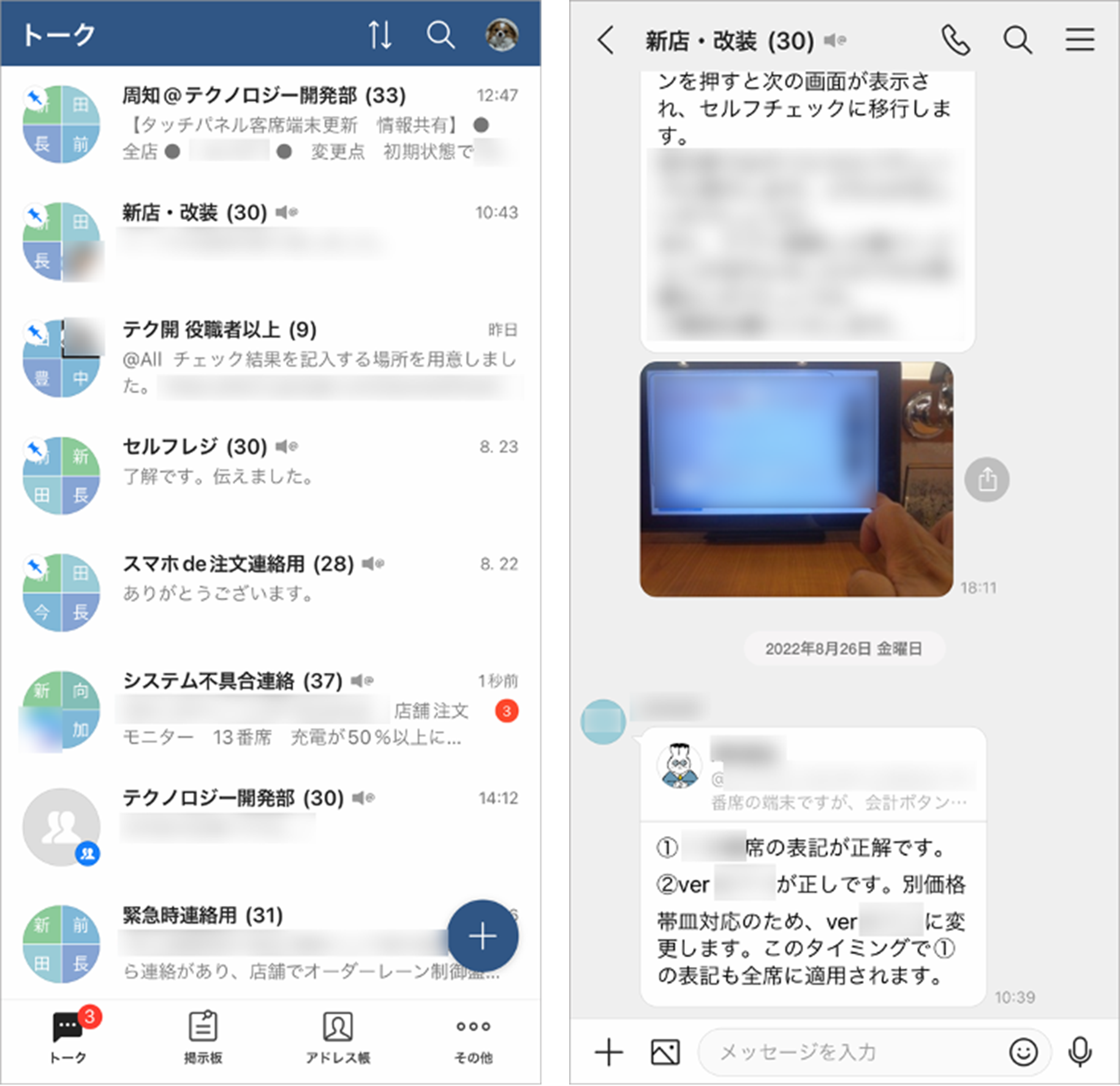 営業部には店舗の設備やシステムに不具合が発生した際の相談を受ける担当者がおり、トラブルが起こった際のヒアリングや、担当者からDXソリューション部へのエスカレーションも全て電話で行うため時間がかかっていました。「LINE WORKS」導入後、店長や責任者からの報告が担当者を介して担当部門にトークで伝えられる仕組みを構築。「タッチパネル」「セルフレジ」など設備別のグループを作成し、各設備の担当者に速やかに情報が共有されるようになりました。複雑な障害の場合などは担当者がビデオ通話で不具合箇所を映してもらいながら確認することで、より迅速かつ的確な対応が可能になっています。