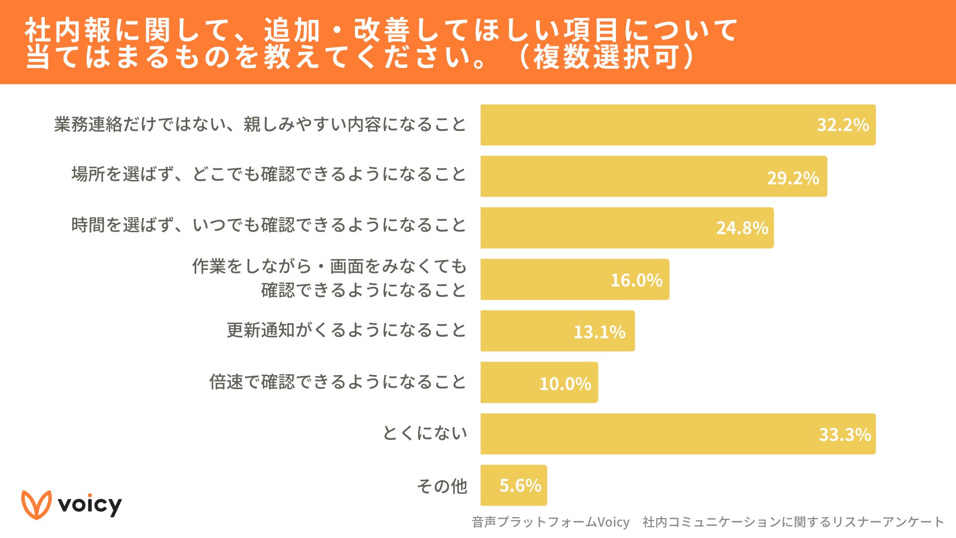 7割の従業員が社内報を重視する一方、3割が開かない。社内報に求める改善点1位は「親しみやすい内容になること」【社内コミュニケーションに関する調査(Voicy調べ)】