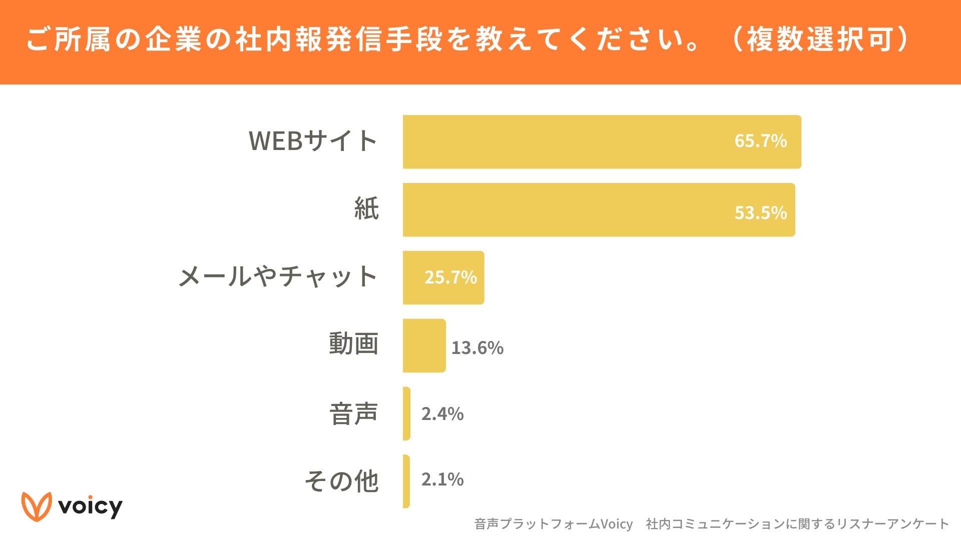 社内報がある企業に所属している方を対象に、社内報の発信手段を聞いたところ、「WEBサイト」が65.7%と最も多く、次いで「紙」が53.5%となりました。