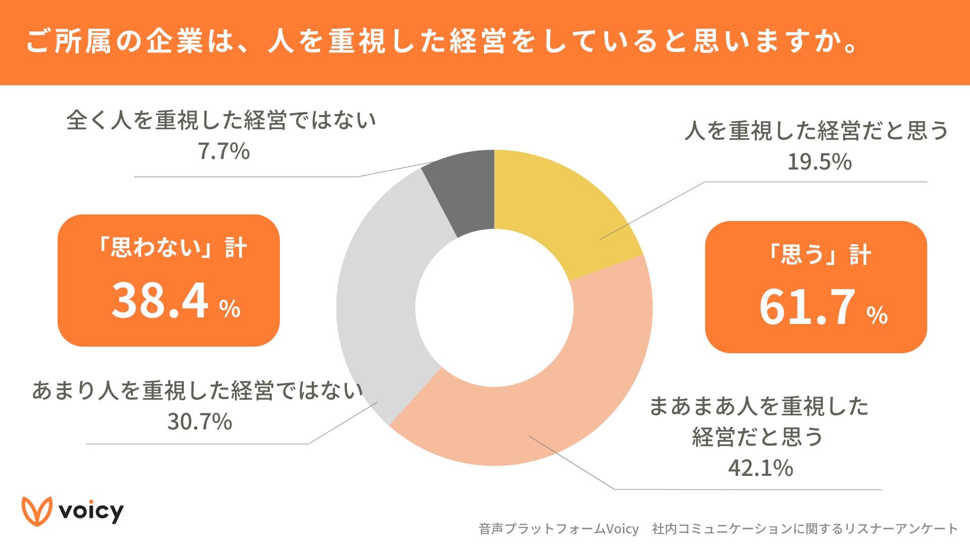 2023年1月に改正された内閣府令で、上場企業に人的資本の開示が義務付けられたことで注目されている「人的資本経営」(※)についても調査しました。「所属する企業は、人を重視した経営をしていると思いますか」という問いに対して、6割以上が「思う」と回答した一方で、4割近くが「思わない」と回答する結果となりました。
