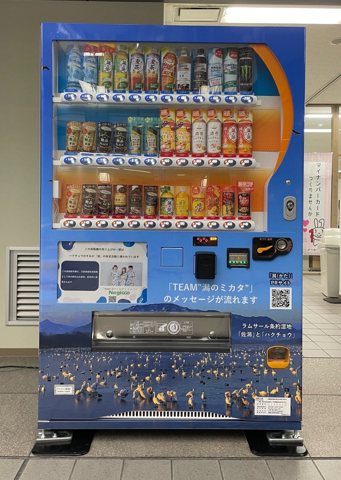 このたび、本連携協定に基づく取り組みの一環として、「国際湿地都市NIIGATA自動販売機」(以下「本自販機」)を同日、新潟市役所に設置いたしました。
