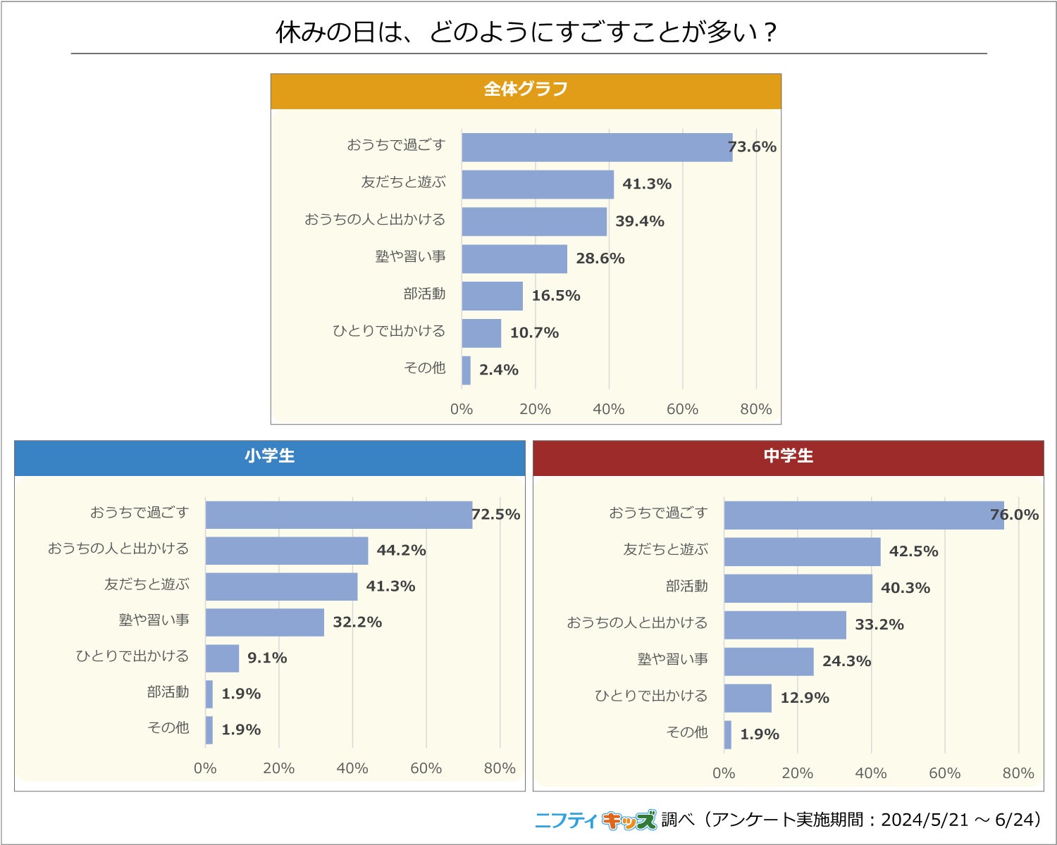 普段の休みの日のすごし方は、73.6%の子どもたちが「おうちで過ごす」と回答しました。中学生になると「部活動」の回答も増えますが、おうちでゆっくりと過ごすことで平日の疲れを癒やす人や、学校や塾の宿題をする人が多いことが考えられます。また、40%前後が「友だちと遊ぶ」「おうちの人と出かける」と回答しました。