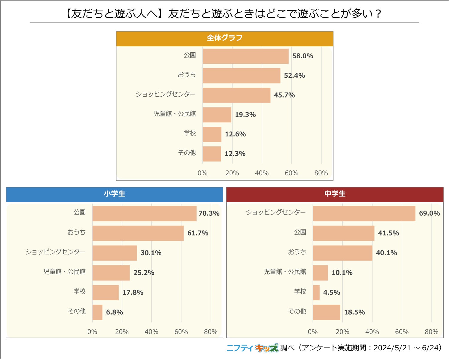 一方、中学生では「公園」「おうち」の割合が低くなり、「ショッピングセンター」が1位でした。小学生よりも行動範囲が広がるため、商業施設などで遊ぶ機会も増えるようです。