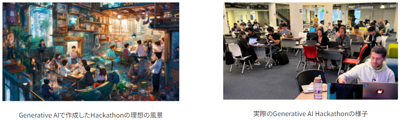 世界的な金融、医療、気候危機に直面する中、人類は多くの時間と資源を必要としています。Generative AIは、人類のイノベーションを加速させ、社会としてより多くの時間と能力を与えてくれる可能性を秘めています。今回「GenLab」が開催したHackathonには、エンジニアをはじめとするたくさんの方に参加していただき、彼らの技術やアイデアを駆使し、短期間で多くの魅力的なサービスやプロダクトが誕生しました。また、左側の画像のように、当初私たちが思い描いていた通り、多くの事業ビルダーたちが集まってアイデアを形にしていく、活気あふれる世界が実現しました。「GenLab」は今後も、自分たちの能力を高め、責任あるAIが実現し得る世界を押し広げると同時に、社会に貢献するテクノロジーを創造していきます。