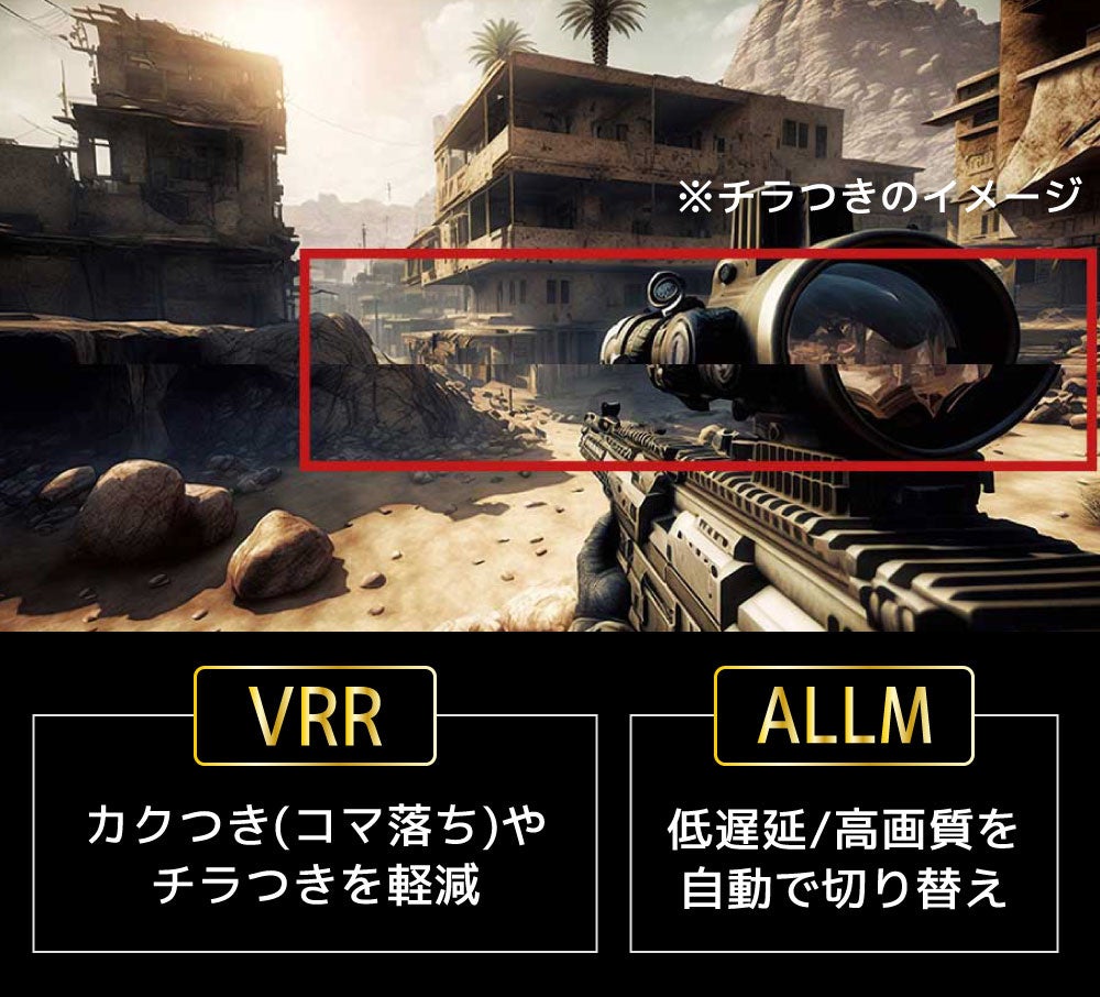 「VRR(可変リフレッシュレート)」は、コマ落ち(スタッタリング)やちらつき(ティアリング)が抑制される技術です。動きの激しいアクションゲームも快適にプレイすることができます。