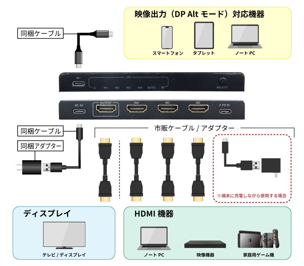製品名:8K60Hz/4K120Hz対応 4入力1出力HDMI切替器 (PD対応USB Type-C×1、HDMI×3)