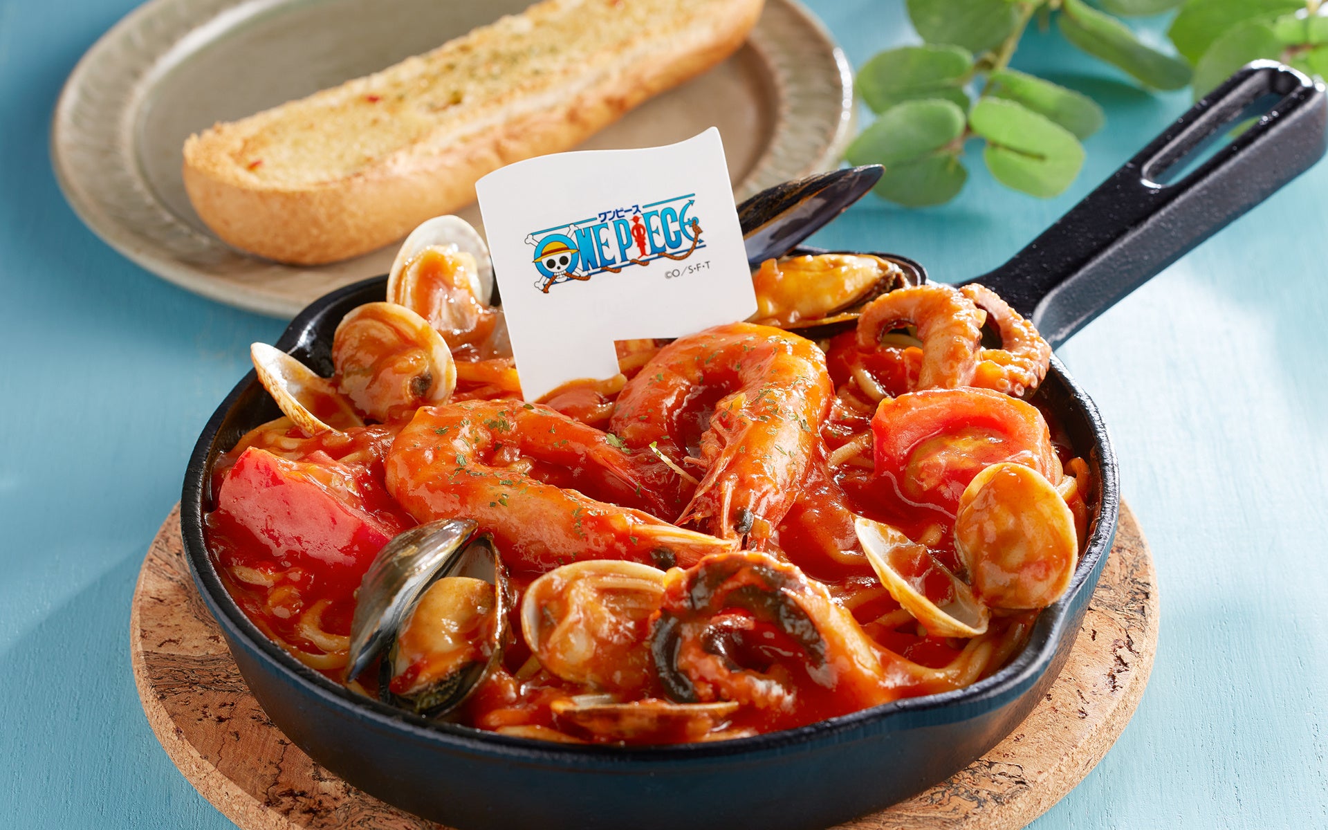 全期間販売メニューは、主人公「ルフィ」の大好物の「お肉」がいっぱいのグリルとトレードマークの麦わら帽子をモチーフにした「ルフィのドン!!と山盛り肉々グリル&麦わらオムライス」。「ゾロ」の三刀流を、えびフライ・ソーセージ・ハリケーンポテトで表現した「ゾロの三刀流鉄板盛り」、サンジのレディたちへの愛情を表現した「サンジのレディに捧げる情熱のペスカトーレ」、デザートは「ナミの大好き♡みかんとベリーの『魔法の天候棒(ソーサリー・クリマ・タクト)』パフェ」をお楽しみいただけます。