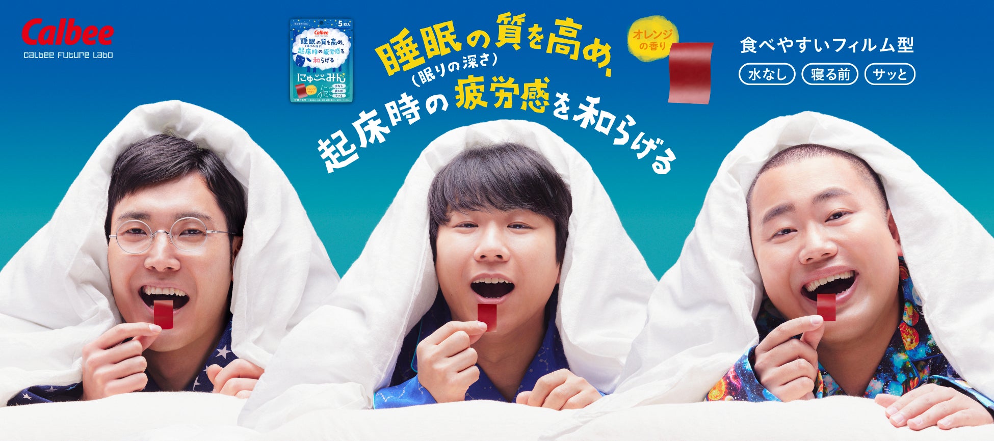 コンテンツスタジオ CHOCOLATE Inc. (本社:東京都渋谷区、代表取締役:渡辺裕介)は、カルビー株式会社(本社:東京都千代田区、代表取締役社長:伊藤秀二)が提供する睡眠サポート食品『にゅ〜みん』のTVCM・WebCMを公開したことをお知らせいたします。本動画は『にゅ〜みん』のプロモーションとして制作されたもので、本番を翌日に控えた夜にベットで眠るお笑い芸人トリオのハナコが登場。菊田一人がぐっすりと眠っているなかで、緊張にうなされてしまう秋山・岡部が『にゅ〜みん』を使用して睡眠の質を高め、すっきりとした目覚めで翌日を迎えるまでの様子を描いています。