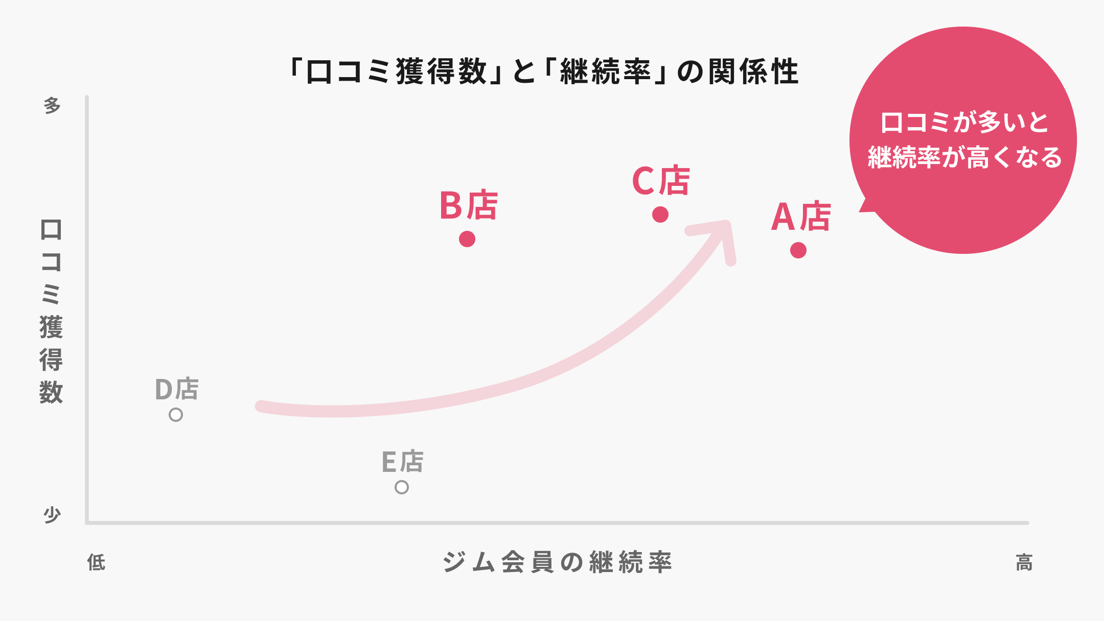 また、口コミが多い店舗では、会員の「継続率」が高いこともわかりました。我々の事業の特性上、長期的なLTV(ライフタイムバリュー:顧客生涯価値)を高めることが重要で、その指標の一つとして会員の継続率があります。この継続率と、口コミの件数が関わっているというのは大きな発見でした。