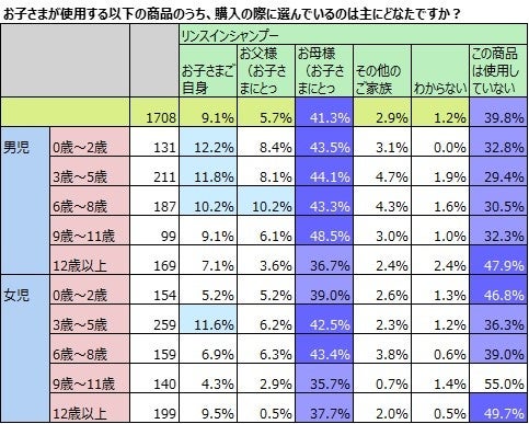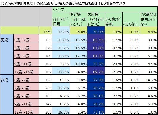 トイレタリー品の購入、小学生以下は男児の方が自分で選ぶ割合が高い。