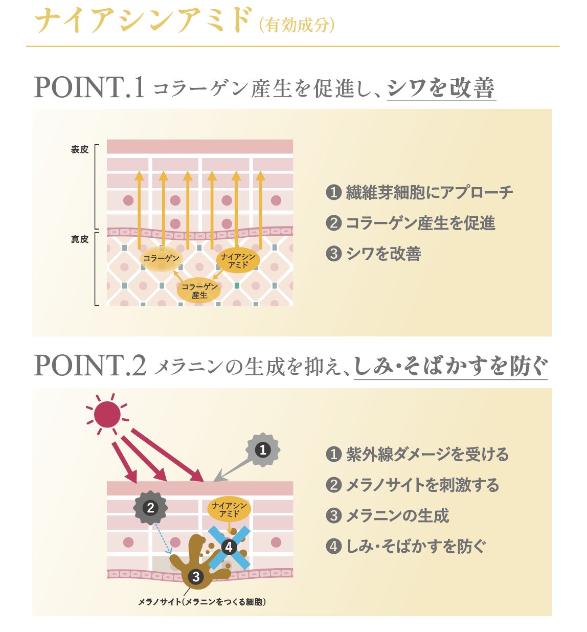 精製水を一切使用せず、美容液成分で構成された美容濃縮液に、有効成分「ナイアシンアミド」を配合した医薬部外品です。プラセンタエキス(保湿成分)をはじめとして、優れた保湿成分が原液のまま肌の奥(角質層)まで浸透し、肌本来の美しさをサポートします。